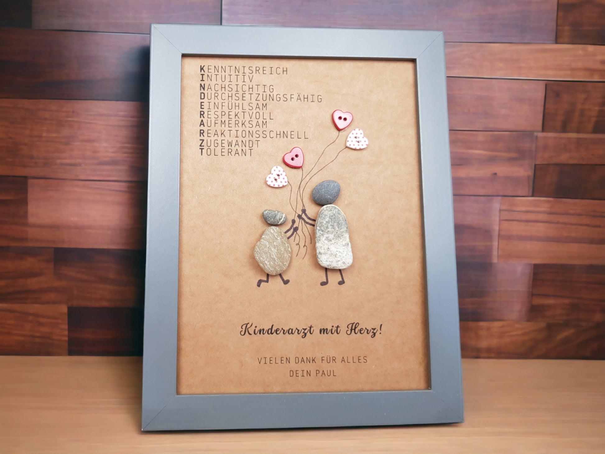 Du möchtest dich von Herzen bei deinem Kinderarzt, deiner Kinderärztin oder dem gesamten Praxisteam bedanken? Dieses liebevoll gestaltete Steinbild aus Kieselsteinen, Knöpfen und kleinen Details ist ein kreatives, individuelles Geschenk für Menschen mit Herz.