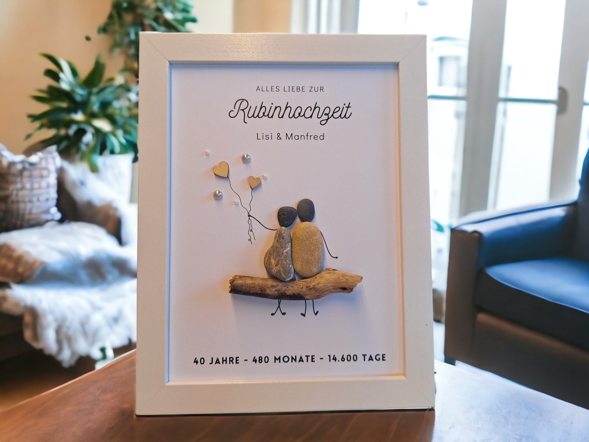 Ein besonderes Geschenk zum 40. Hochzeitstag, das von Herzen kommt: Dieses liebevoll gestaltete Steinbild zur Rubinhochzeit ist eine wundervolle Überraschung – ob als Paar- oder Familienbild, personalisiert mit Namen, Datum oder einem individuellen Spruch.